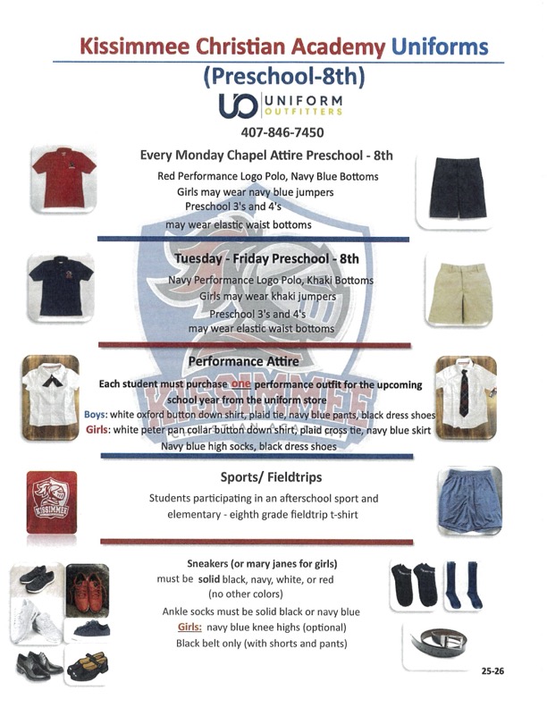 Full uniform will be worn by Preschool through 8th students. Those uniforms are available through Uniform Outfitters. Contact the school office for more information.